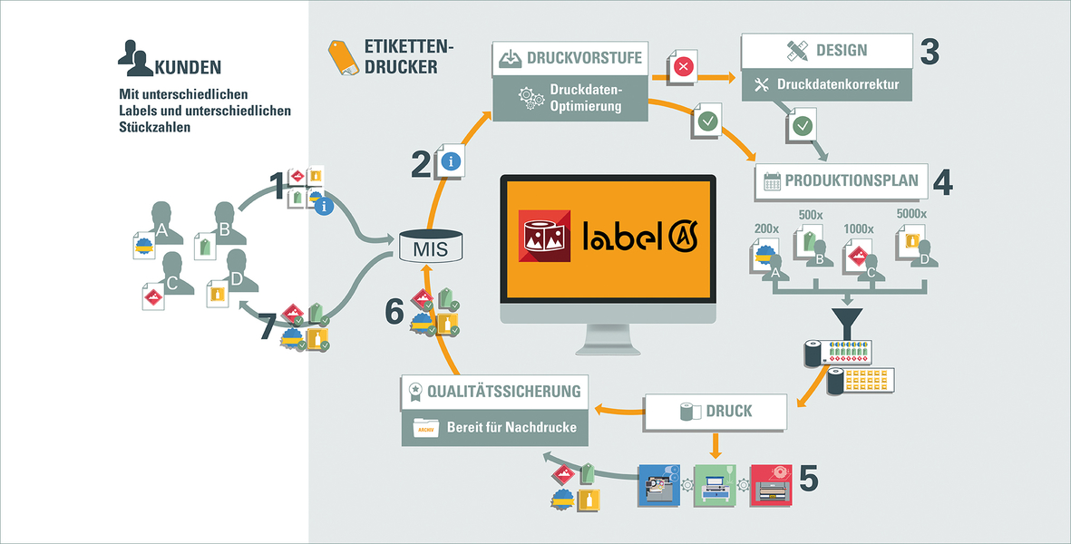 Die Label Automation Suite setzt beim Auftragseingang an und automatisiert den gesamten Etikettenproduktionsprozess inkl. Datenaufbereitung, Produktionsplanung, Vorbereitung von Veredelung und Finishing und Maschinenansteuerung.