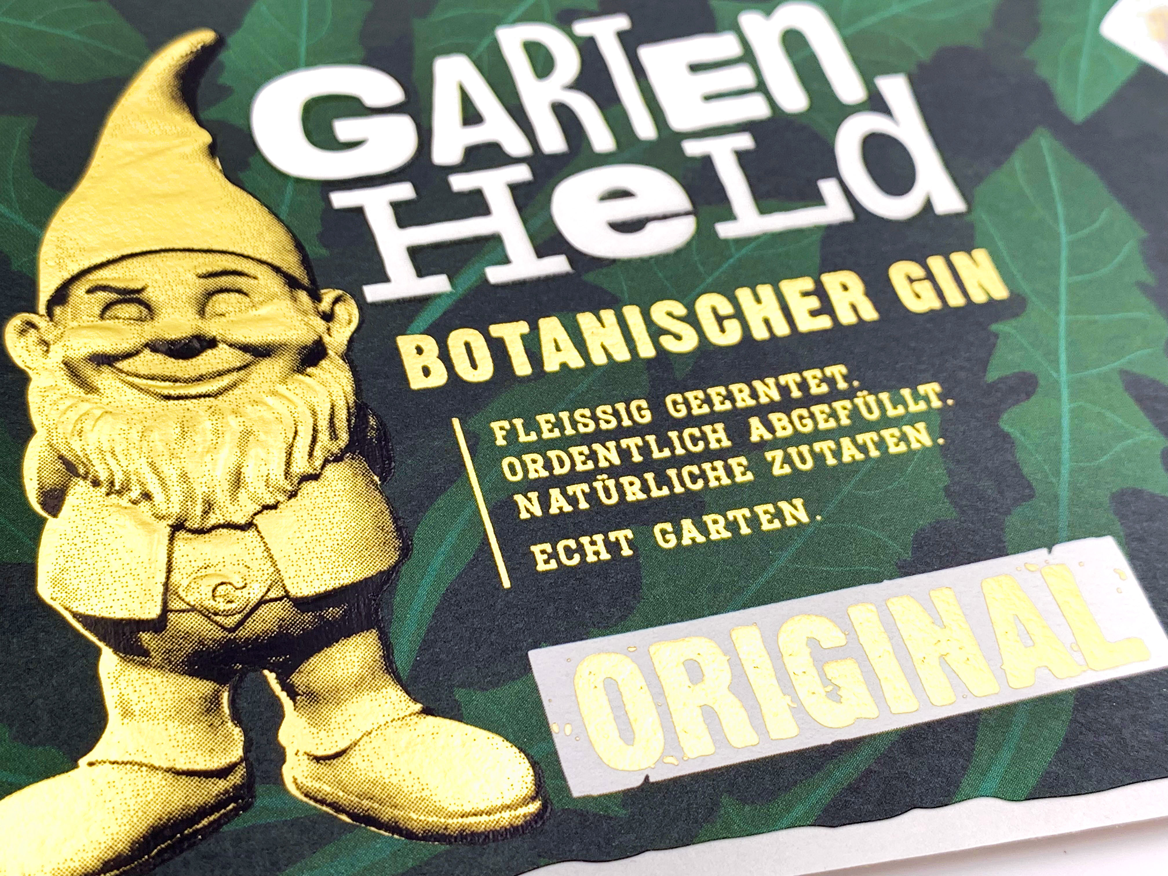 Diese Saison ist uns die Etikettenausstattung ‚GARTENHELD ORIGINAL' besonders aufgefallen: die Etiketten wurden im Offsetdruck auf dem Naturpapier ‚Arctic' produziert. Der charakteristische Gartenheld Schriftzug wird durch einen partiell aufgebrachten Relieflack in Szene gesetzt. Feine Textelemente sind gold-geprägt, oder als Negativschrift wiedergegeben. Dabei kommt das frische Arctic – Weiß besonders zur Geltung. Der Gartenheld ist ebenfalls gold-geprägt. Die haptischen und optischen Effekte wurden im Nachgang durch eine Blindprägung und einen Konturendruck erzeugt. Ein heldenhaftes Gesamtwerk!