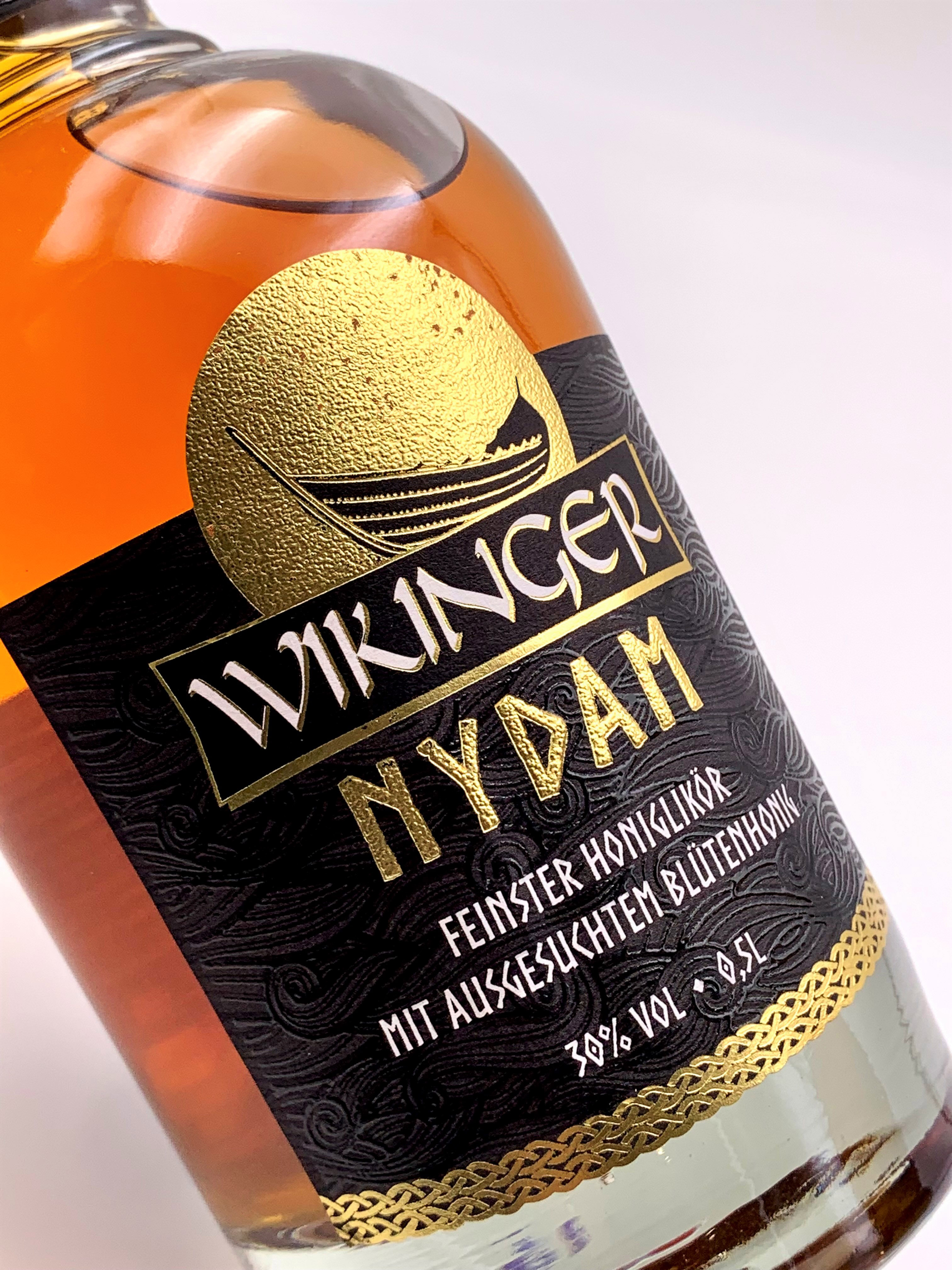 In einer ausdrucksstarken Blattgoldoptik mit disruptiven Strukturen werden feine und detailverliebte Bootsstrukturen ebenso abgebildet wie der wuchtige und zentral positionierte Nydam Schriftzug.