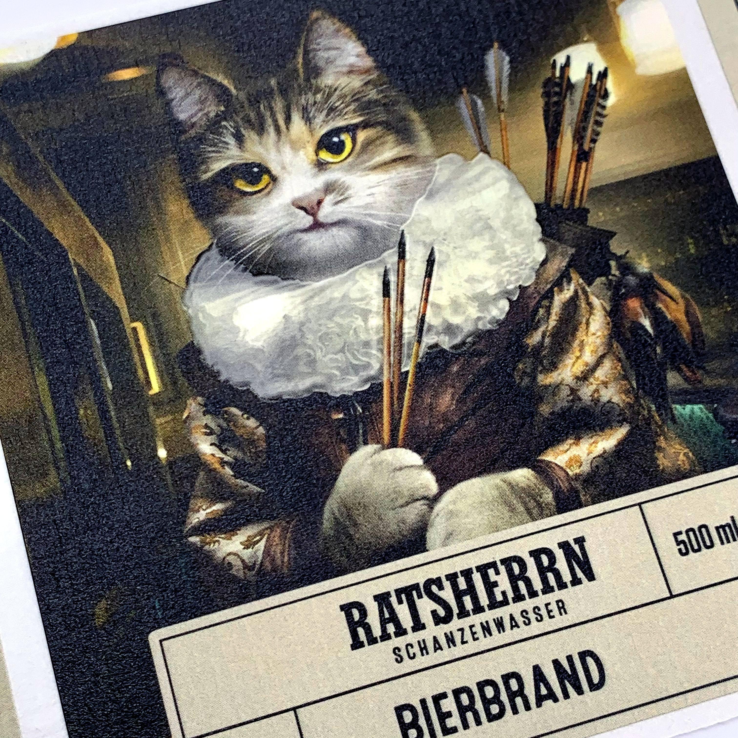 Diese Saison ist uns die Ratsherrn-Etikettenausstattung besonders aufgefallen: Im hochauflösenden Digitaldruck werden die Stadträte Katze, Eichhörnchen und Hase perfekt in Szene gesetzt und widergespiegelt. Das hochstrukturierte ‚Verge Blanc‘ unterstreicht dabei den mittelalterlichen Charakter. Die durch Relieflack veredelte, haptische Halskrause gibt den finalen Schliff.